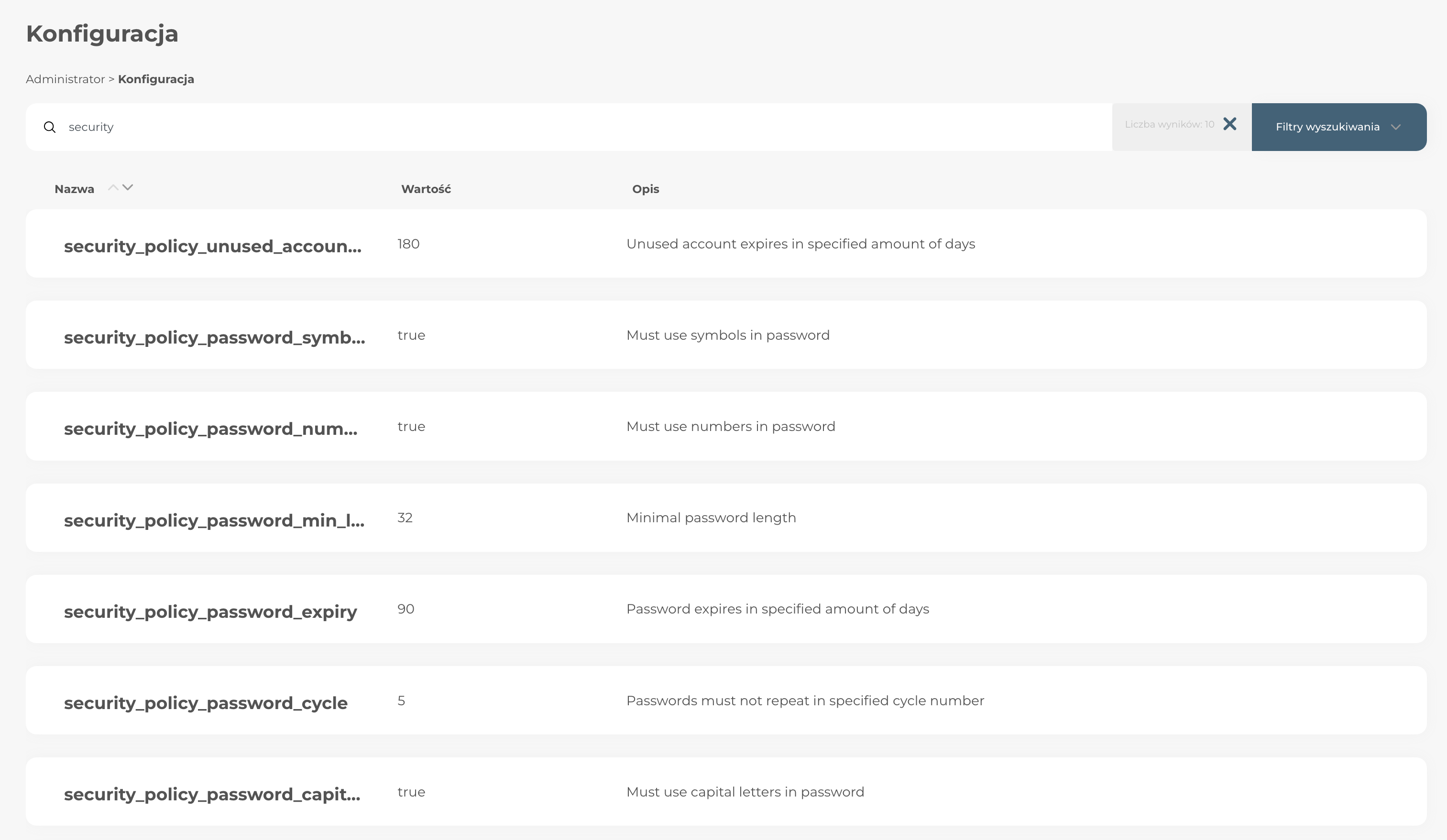 - security_policy_password_min_length – default 16 – wymagana liczba znaków hasła